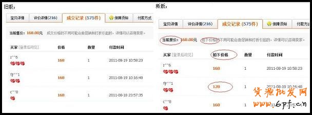 1、寶貝詳情頁面展示的打折成交記錄(包括歷史成交價格)調整為“拍下價格”,除“淘寶VIP”、“店鋪VIP”、“滿就送”、搭配套餐、店鋪優惠券的交易仍顯示為一口價外,其他形式的成交將顯示為“拍下價格”,對應的更改如下