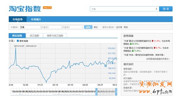 在市場趨勢當中,我們可以知道“女裝”的搜索指數(shù),地域細分,以及人群定位的分析。通過這些數(shù)據(jù)來確定寶貝貨源的選擇,以及選擇哪個年齡層面的服裝比較適合。