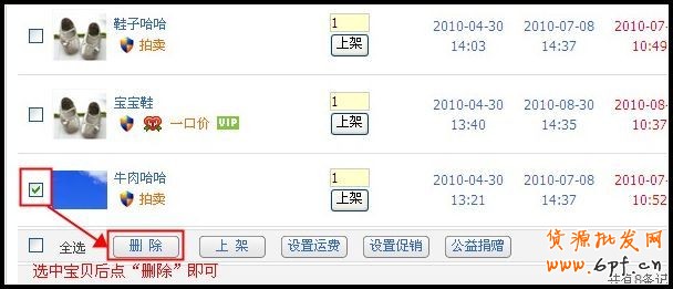 進入賣家中心,查看“出售中的寶貝”或“倉庫中的寶貝”,若想徹底刪除寶貝,勾選后點擊“刪除”即可(如圖);若想讓“出售中的寶貝”暫時不要在店鋪中顯示,建議您勾選后點擊“下架”,這樣后續如果要重新上架,進入“倉庫中的寶貝選擇上架即可。