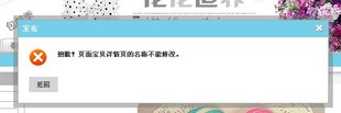 裝修了店鋪首頁后,點擊發布,出現“抱歉!頁面寶貝詳情頁的名稱不能修改” 給淘寶客服留言N次,問題沒有得到解決。給客服打了兩次電話,一樣無法解決。已經過去一個月了,真的是急死人了。誰能告訴我怎么辦??!