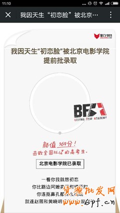 “測(cè)試顏值”這款游戲從頭到尾都在“挑逗”受眾的情緒。一個(gè)理想的應(yīng)用場(chǎng)景是,高考放榜前夕,某個(gè)考生在刷朋友圈時(shí)看到好友發(fā)出一條消息——我因顏值爆表被北京大學(xué)錄取。這時(shí),他首先產(chǎn)生的情緒是“好奇”,點(diǎn)開頁(yè)面之后,會(huì)看到好友的自拍照和顏值分?jǐn)?shù),這時(shí)產(chǎn)生的情緒可能是“搞笑”。如果好友顏值是670分,打敗全國(guó)70%的考生,考生可能會(huì)產(chǎn)生“攀比”心理——要不我也試一下?得分高的話,他可以發(fā)朋友圈炫耀一下,游戲進(jìn)入下一輪傳播;如果是低分,那也可以重新上傳照片,再嘗試一遍。即使依舊低分,那分享給好友們自黑下也無(wú)妨。