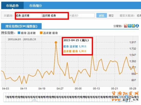 通過上圖數據顯示和關鍵詞設置成有空格,即使順序顛倒了,但是搜索量還是一樣的。但如果關鍵詞當中是沒有空格的,在搜索“修身連衣裙”和“連衣裙修身”時,關鍵詞的順序顛倒,搜索量卻差了很多倍。