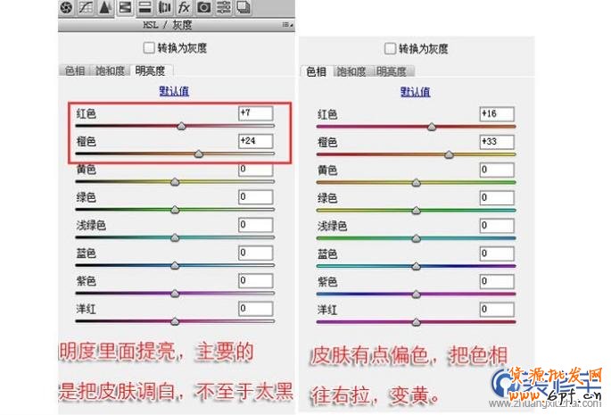 明度里提亮,主要是把皮膚調白,不至于太黑。皮膚有點偏色,把色相往右拉,變黃。