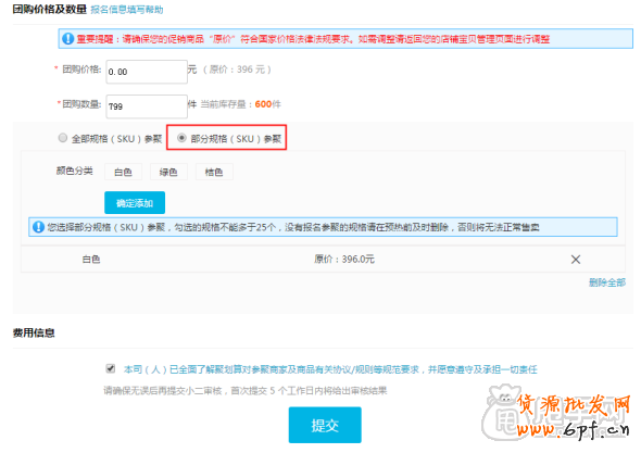 三、如果是選擇部分規格商品參聚可以選擇“部分規格參聚”,部分規格參聚同樣會影響參聚價格(按照部分規格30天最低價校驗),如下圖: