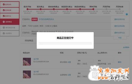 四、在需要參聚的商品價格庫存都填寫完畢后,可以點擊“提交”,此時系統進行商品提交操作,如果出現異常會直接告知錯誤提示,如圖: