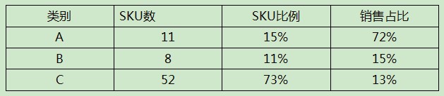 將累計配貨次數為50%的前若干品種定為A類;將配貨次數為20%左右的若干品種定為B類;將其余的品種定為C類。如: