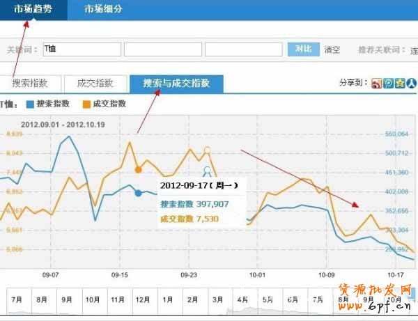 返回的搜索結果我們可以看到,10月份(這個地方的月份可以調整)羽絨服無論是搜索量還是成交量都成增長趨勢,證明這個關鍵詞是當季熱賣產品。如果這個地方呈下降趨勢,那說明是主體市場走勢方向在下降,你需要做的是調整公司的產品。比如說我們這時候再去賣T恤肯定是不適合的。下面看下T恤的搜索指數。