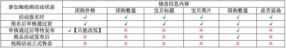 為了維護淘搶購平臺的經營秩序,更好地提升淘搶購商家的服務質量,保障淘搶購消費者的相關權益,淘搶購業務對報名過程中信息修改進行規范。在報名、審核、排期、發布、活動各環節修改項以下列表格為準: