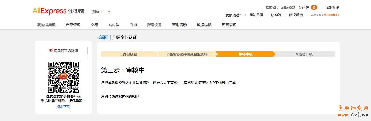 已提交公證書或原店鋪個(gè)人認(rèn)證者與企業(yè)營業(yè)執(zhí)照上法人一致,則等待資料審核,審核期間賣家可登陸后臺(tái)查看當(dāng)前狀態(tài)進(jìn)展;