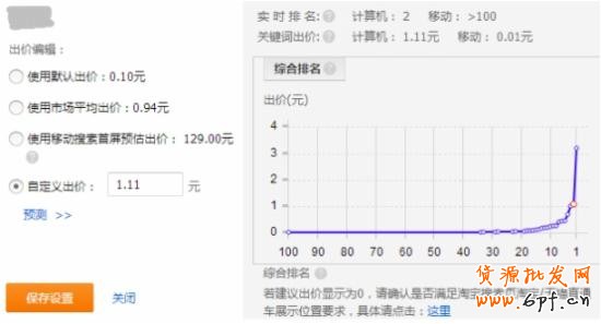 2、通用詞出低價然后搜索人群高溢價。因為通用詞面對的人群很廣,例如“面膜”這個關鍵詞,搜索這個關鍵詞的有想買補水保濕面膜的,有想買美白面膜的,還有想買祛痘面膜的,這些人都會搜索“面膜”。無論你的面膜功能多全,知名度多高,必定大部分人都不會買你的面膜。如果你直接出高價搶占第1名,結果自然是虧死。此時的策略是低出價,低到第一名出價的1/4左右,然后通過“搜索人群”功能給優質訪客增加300%的溢價。這樣做的目的是讓搜索這個關鍵詞的人大部分看不到你,但是你店鋪的優質訪客可以在第1名的位置看到你的推廣。如下圖所示: