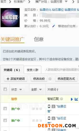 關鍵詞設置匯總加入步驟1中我們找到的所有詞。出價盡量低,定向推廣打開,我們的出價原則是獲取每個詞的展現,點擊量可以很少,只要每天有一兩個點擊就可以了。
