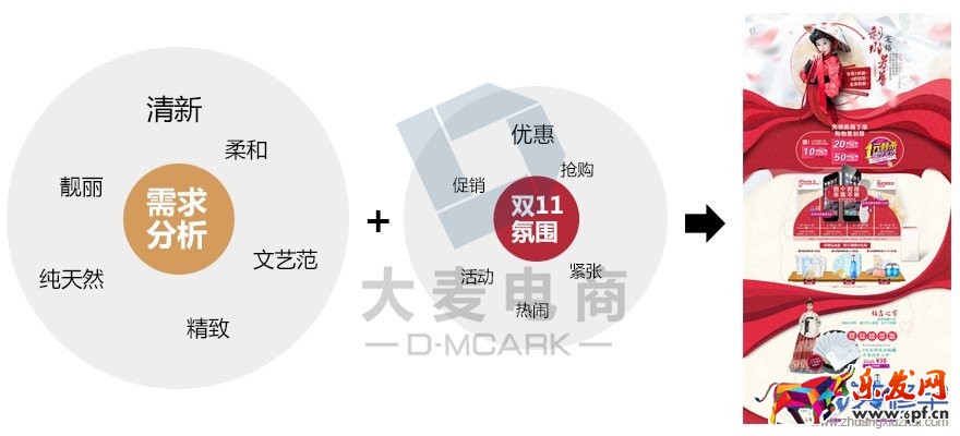 當(dāng)看到要先為頁面定位時,相信很多人都納悶了,“雙11定位還要多想嗎,肯定是促銷、喜慶啦”。當(dāng)然,促銷和喜慶是固然的,也是我們雙11活動的主要基調(diào)。然而,要從千軍萬馬中先拔頭籌,我們一定要靜下心來,理性分析店鋪的定位與用戶需求,盡可能將這些需求通過具象的詞表現(xiàn)出來。并與雙11的促銷氛圍有機的結(jié)合,形成有店鋪特色,有情感的雙11落地頁,在滿足用戶想要優(yōu)惠的理性需求的同時滿足用戶的情感需求。