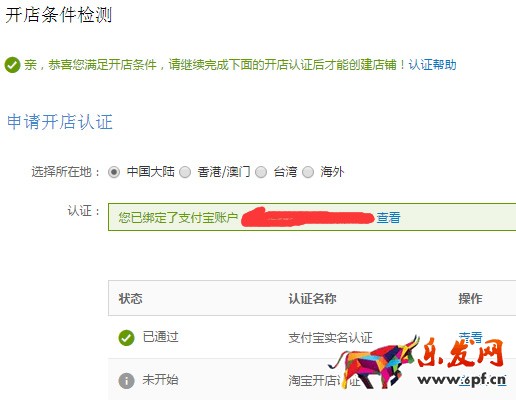 三、完成淘寶賬號和支付寶認證后,再次回到淘寶首頁,點擊賣家中心——免費開店。來到免費開店的頁面后,點擊個人店鋪,親們就會看見開店條件檢測,只要按著小編的心得完成前面兩步,開店條件檢測肯定如下圖一樣,只差淘寶開店認證未完成。