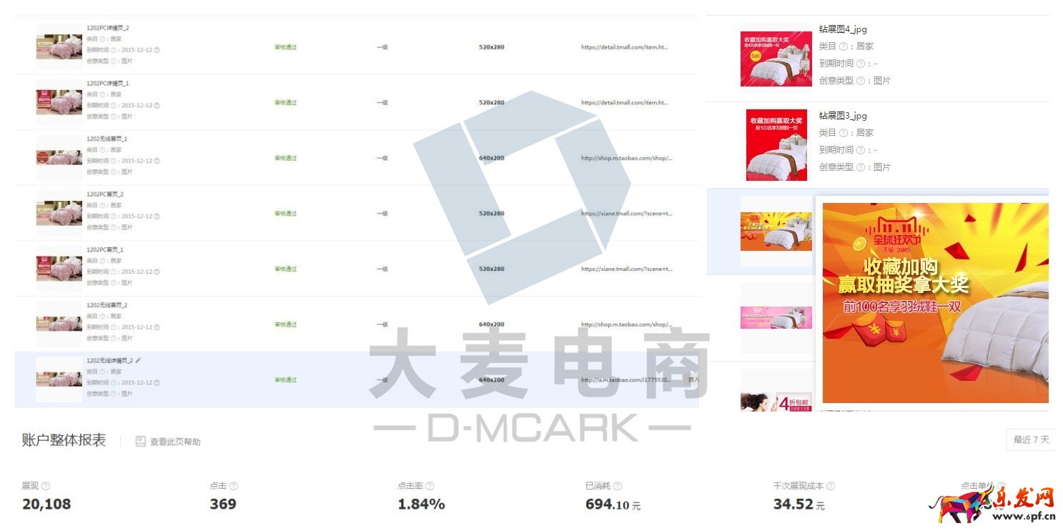 ②投放位置選擇。對于家紡類目而言,測試出來效果最好的位置是首焦、以及首焦右側banner,其余位置經過測試點擊率并不是特別好。