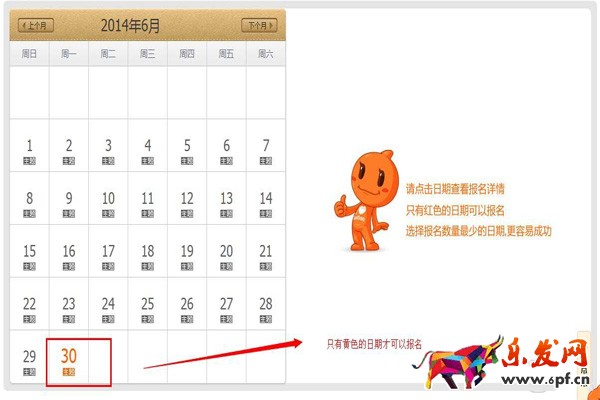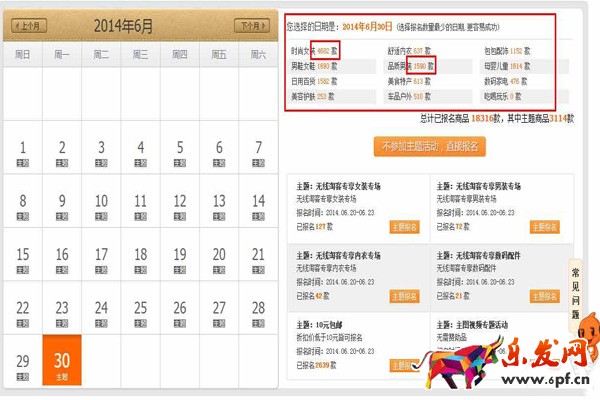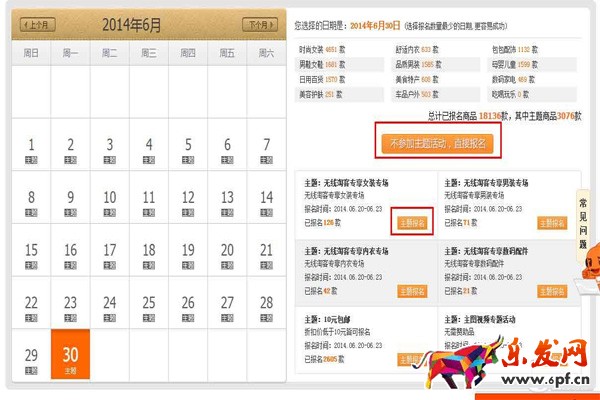 當賣家進行天天特價報名時,網頁會彈出一個選擇報名日期的窗口,賣家可以點擊日期查看報名詳情,只有橙色的才能報名,如下圖。