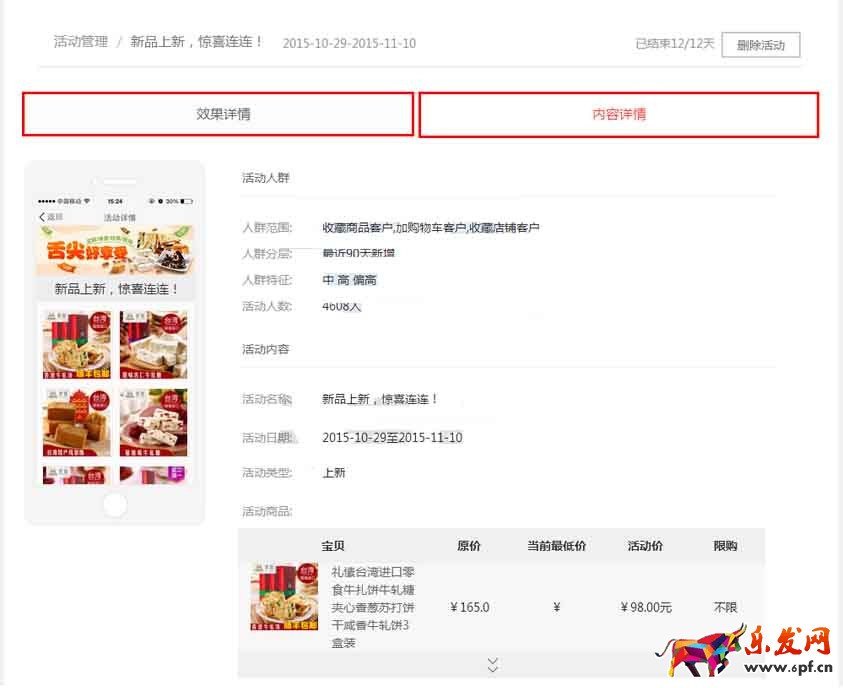 當活動設置成功后,我們可以回到活動列表,查看已經設置好的活動,在活動開始后,在效果詳情頁還可以查看前一天活動相對應的數據。