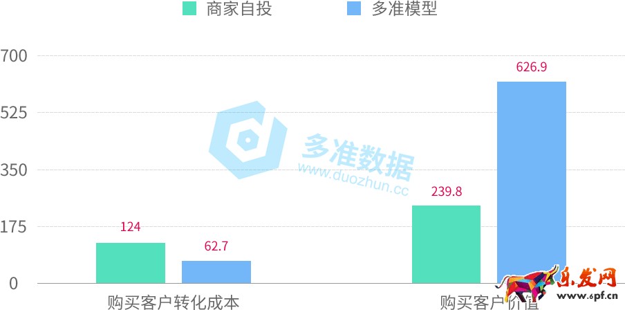 相比商家自投,點(diǎn)擊單價差不多,我們投放的點(diǎn)擊率提高了29%,ROI提高了237%;同時客戶轉(zhuǎn)化成本降低了49%,單個客戶價值卻高出了161%。