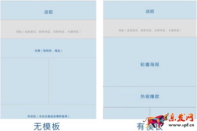 我們需要根據店鋪后臺的具體條件進行首頁布局規劃。如圖:(有模板布局 無模板布局)