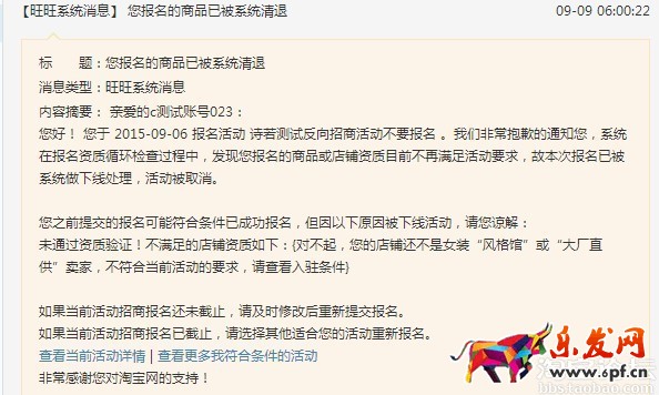 A.收到千牛或旺旺清退通知(如下圖)則代表當(dāng)前報名的商品已被系統(tǒng)自動清退,系統(tǒng)會告知清退原因
