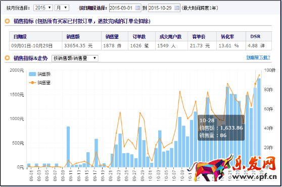 店鋪是2015年8月11日正式開店。小編接手操作時(shí)間是2015年9月1日。接手到現(xiàn)在整2個(gè)月的時(shí)間,大家看一下現(xiàn)在店鋪數(shù)據(jù):UV和銷售情況