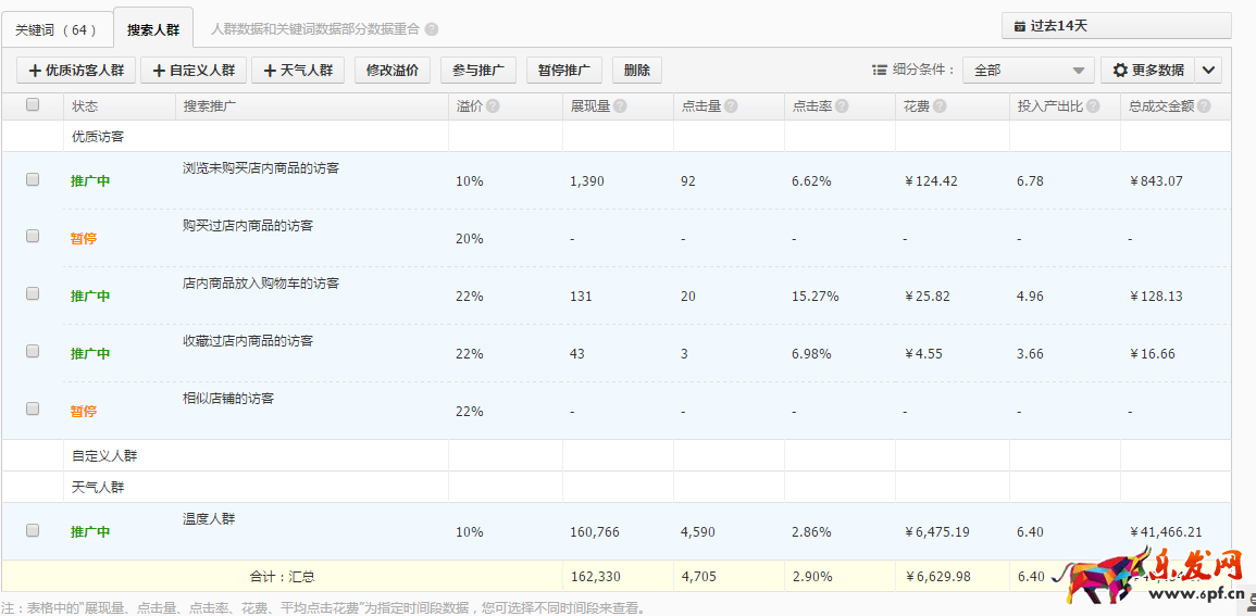 一般在調(diào)整關(guān)鍵詞的時候都會看到這個部分,雖然后臺設(shè)置中,搜索人群不沒有歸類在定向推廣中,但是嚴格來講搜索人權(quán)的設(shè)置,就是基于關(guān)鍵詞基礎(chǔ)上的針對特定人群的一種選擇性投放,換句話說也是符合我們所說的定向推廣的概念的,不過看到是一回事,用起來又是一回事,很多掌柜常常覺得關(guān)鍵詞是直通車的重中之重,只要關(guān)鍵詞優(yōu)化的好,轉(zhuǎn)化一定沒問題,但是有句話說的好“存在即是合理”,所以可想而知,定向推廣放在這里絕對是對寶貝推廣有著很大的作用的,另外還有一個很容易忽略的地方,就是關(guān)鍵詞推廣中的搜索人群部分