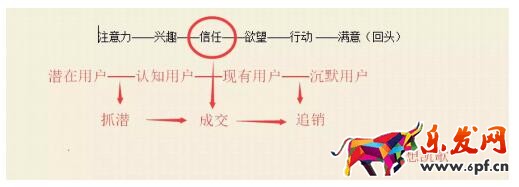 2、這三個階段消費者總共經歷6個點:注意力——興趣——信任——欲望——行動——滿意