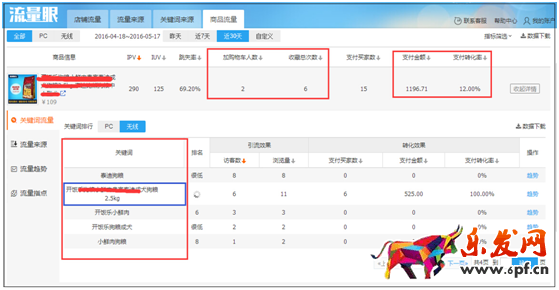 可以看到,優化的空間很大,這就是一個優質寶貝?,F在我們需要做的就是對這個寶貝“順勢”而來的關鍵詞進行優化。藍色框中的關鍵詞你不用去考慮,因為那個關鍵詞是補單補出來的,這個店鋪新換的運營,否則我指導的運營,我絕度不會讓他干這事兒的。