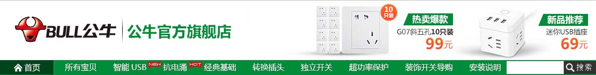 店頭,公牛的代理商基本都用統一規格的店招設計,在設計使用的時候賣家提供的店招尺寸有點過小,990px的寬度是常規的設計尺寸,但目前市面上的顯示器基本都是使用寬屏,大部分的賣家店招會做成1125-1185px,能夠與下方的展示界面對齊,相對的展示空間可以寬松一點。另外就是店頭的文字排版,現在的顯示過于緊湊與凌亂,如果把所有的內容切成小塊,就可以看出排版間的問題;