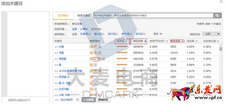 關鍵詞選擇和寶貝屬性、賣點和相關性較高,搜索量靠前的關鍵詞。數量在30個以上,可以通過淘寶下拉框找到熱搜詞、淘寶你是不是想找、生意參謀的熱搜詞或是店內有轉化的詞,還可以通過直通車計劃的添加關鍵詞選擇。關鍵詞出價在市場均價的80%,如果想快速拿到數據,則可以高于市場均價的20%,再根據具體情況進行調價??紤]到PC和無線的流量配比,關鍵詞的無線折扣不能太低,以防萬一拿到的數據都是PC端的。