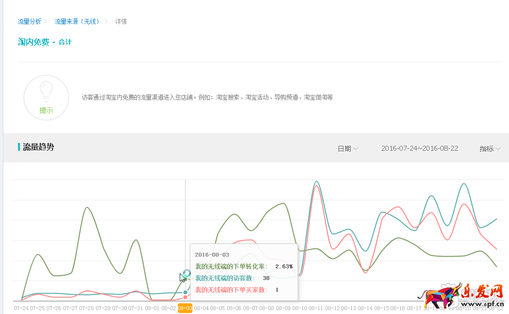 8月3號無線端訪客數38,下單買家1人,支付轉化率2.63%。8月22號無線端訪客是有達到405人。