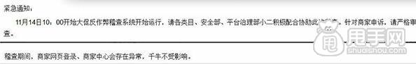 點(diǎn)評(píng):看來是針對(duì)雙十一虛假交易的商家進(jìn)行一次大規(guī)模的查處,感覺阿里有點(diǎn)“卸磨殺驢”的感覺,雙十一當(dāng)天銷售額是上去了現(xiàn)在又來查處。