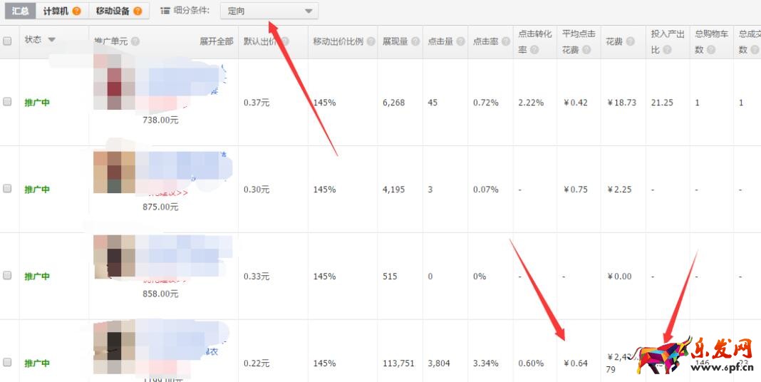 可以看到,ppc在0.64的情況下,投產只有2.32,也就是說,優化PPC的時候,我們一般是習慣整體調控,也就是說,今天PPC是0.8元,ROI2.5,我們想把投產做到3,那么PPC降到0.64就可以了。(至于為什么是0.64,我這里不再去算)但是,我們有部分實際上不需要降價,剛才那個ROI 2.5,細分到關鍵詞和定向,關鍵詞的ROI如果是3,定向的ROI是2,花費一樣。那么關鍵詞是不需要降的!所以說我們要單獨建立定向計劃!本身定向和關鍵詞的轉化都差很多。
