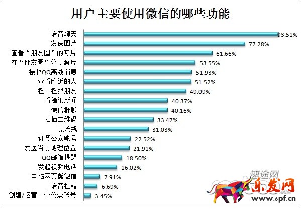 語音聊天是用戶首選的微信功能,93.51%的用戶使用微信這一功能,其次是發送圖片功能,77.28%的用戶使用這一功能。微信的到來,帶來了免費的語音通話,免費的圖片發送,這種方便快捷又免費的方式準確的切中了用戶的需求點,這也是微信推出后用戶量迅速突破3億的一個重要原因。
