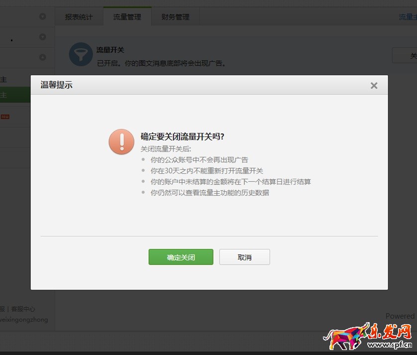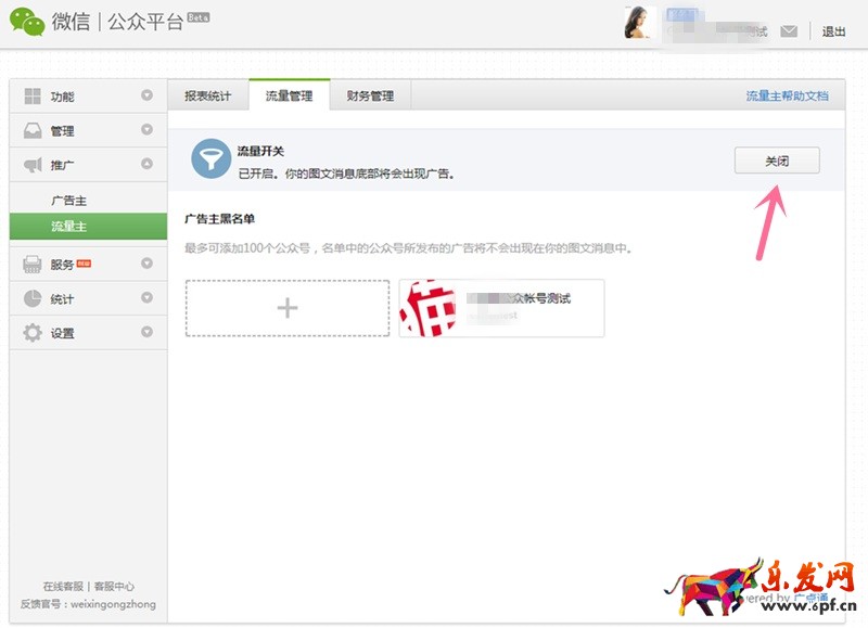 報表統(tǒng)計很好理解,重點說一下流量管理。在這里你可以選擇關閉和開啟廣告。比如,某幾天重要日子,你不想顯示廣告,就可以臨時停止。如下圖::K%F,ZN"B.X!w]#C