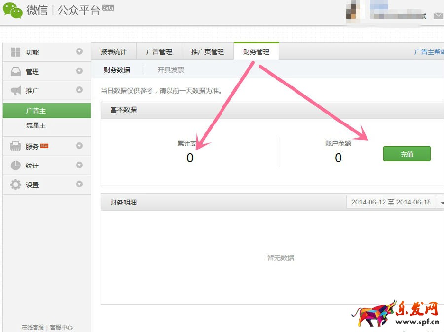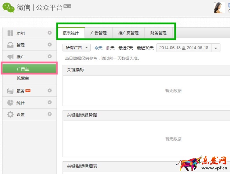 接下來,讓我們再看看廣告主。共有報表統(tǒng)計、廣告管理、推廣頁管理、財務管理幾個選項。