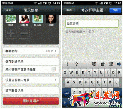 我們還可以給聊天群取一個名字:點擊群聊對話框右上角圖標,進入“聊天信息”頁面,選擇“群聊名稱”,OK,輸入我們想要的群名稱再保存就可以了。