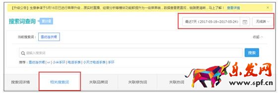 我們打開生意參謀——市場(標準版以上)——搜索詞分析——搜索詞查詢——輸入“雪紡連衣裙”,選擇最近7天的數據,選擇無線端,然后在“相關搜索詞”這個功能模塊,生意參謀的市場行情一共會給你推薦500個詞,全部都是圍繞這“雪紡連衣裙”的。