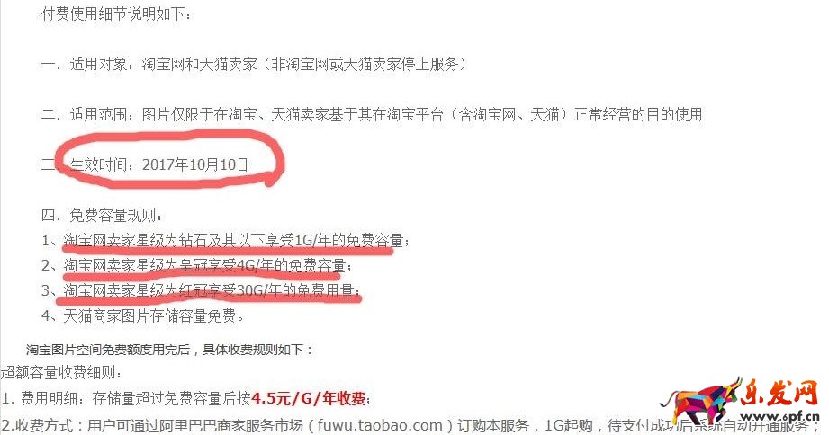 該通知表明從2017年10月10日起,淘寶圖片空間將告別免費時代,新手賣家最多免費使用1G/年,對于存儲量超過免費容量的部分將按照4.5元/G/年收費。