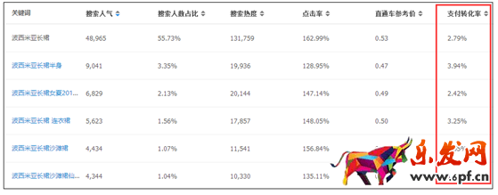 這個指標(biāo)不用多說了吧,哪怕你的搜索人氣再高,點擊率再高,在線商品數(shù)再少,再相關(guān),換句話來說,大部分?jǐn)?shù)據(jù)表現(xiàn)都非常出色,但是支付轉(zhuǎn)化率為零,這種詞你根本不用去考慮,加上反而影響你整個標(biāo)題的權(quán)重。