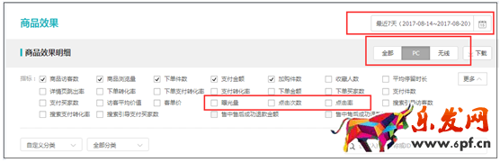 打開你的生意參謀——商品——商品效果——最近7天的數(shù)據(jù),然后看PC端的數(shù)據(jù)(當然,你會告訴我,現(xiàn)在誰還看PC端的數(shù)據(jù),都看無線端了好不好,但是你要注意,目前生意參謀無法把曝光量、點擊次數(shù)這些數(shù)據(jù)表現(xiàn)出來,并且從整體效果上來看,你探查的是點擊率,這是有一定的代表性的)