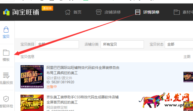 在打開的當前詳情裝修界面中,點擊左側的【模板】