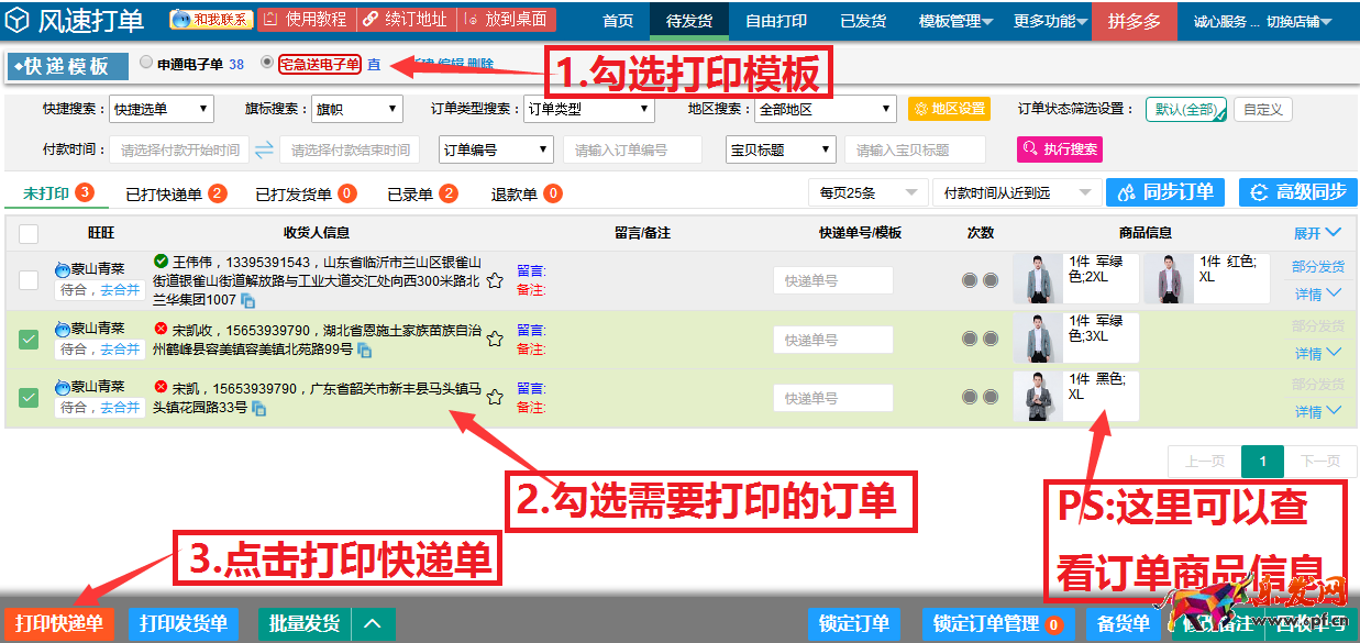 8. 首先選擇打印模板,勾選需要打印的訂單,然后點擊下方“打印快遞單”,出現彈窗,選擇打印機,最后點擊打印就行了。