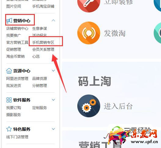 07、又回到賣家中心的頁面,在左側(cè)找到“營銷中心”下的“手機(jī)營銷專區(qū)”。