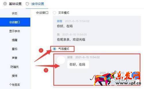 如下圖所示。 我們進入“接待設置”界面“會話窗口”中,選擇【氣泡模式】后,在下面窗口會顯示出預覽效果, 這樣操作到位就可以了。
