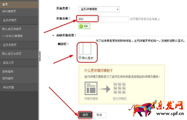 3、頁(yè)面名稱設(shè)置為“001”,在高級(jí)頁(yè)面設(shè)置欄中,選擇側(cè)邊欄“默認(rèn)顯示”單選按鈕,單擊保存按鈕,如圖所示。