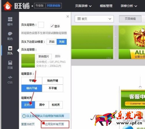 ?3 設置背景顯示選擇橫向平鋪,設置背景對齊選擇左對齊,最后記得點擊應用到所有頁面。