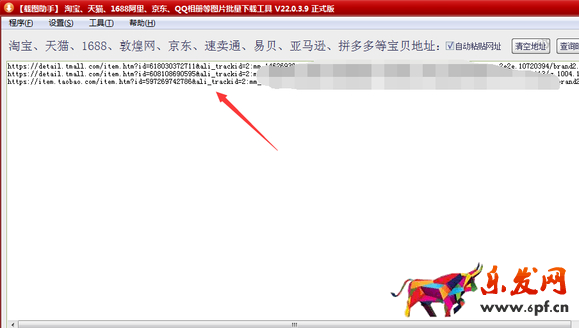 可以進行多個商品一起批量下載,商品鏈接一行一個復制并粘貼到【載圖助手】軟件首頁的地址欄框里,如圖: