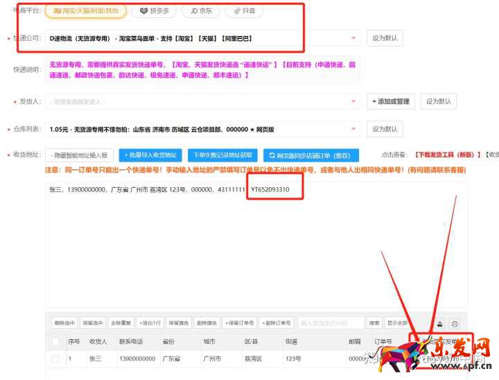 示例:張三,13900000000.廣東省 廣州市 荔灣區(qū) 123號,000000.43111111.YT652093310(YT652093310就是上家的物流單號)