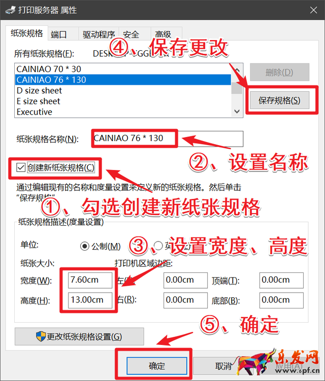 3、設置打印服務器屬性(如下圖)①、勾選創建新紙張規格②、設置規格名稱③、設置寬度、高度(單位選公制)④、保存更改⑤、確定