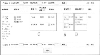 如果填寫全站折扣率后,又繼續(xù)對(duì)該商品設(shè)置手機(jī)折扣率,PC端將只出現(xiàn)全站折扣率,無線端將出現(xiàn)你設(shè)置的手機(jī)折扣率。比如:設(shè)置商品A的全站折扣率為75%OFF,設(shè)置它的手機(jī)折扣率為80%OFF,當(dāng)促銷開始后,買家通過PC端訪問A商品頁(yè)面時(shí),他將看到75%OFF的折扣率,當(dāng)他通過無線端訪問時(shí),將看到80%OFF的折扣率。